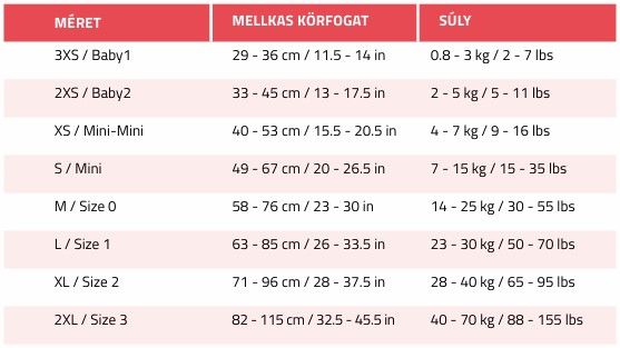 A kutya mellkasának körfogatát a mellső lábak mögött körülbelül négyujjnyi távolságra mérjük az M/Size 0, L/Size 1, XL/Size 2, 2XL/Size 3 és 3XL/Size 4,